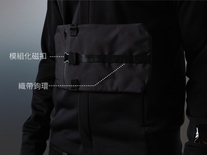 延續M-System的磁吸式模組化設計理念,Ultra Hoodie 2.0搭配升級版M-System Pack 隨身包2.0,可以肩背、手持、固定在模組連帽外套上