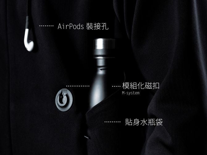 A comprehensive evolution of the hooded jacket, made of highly functional windproof and waterproof fabrics, and equipped with a magnetic expansion module system.